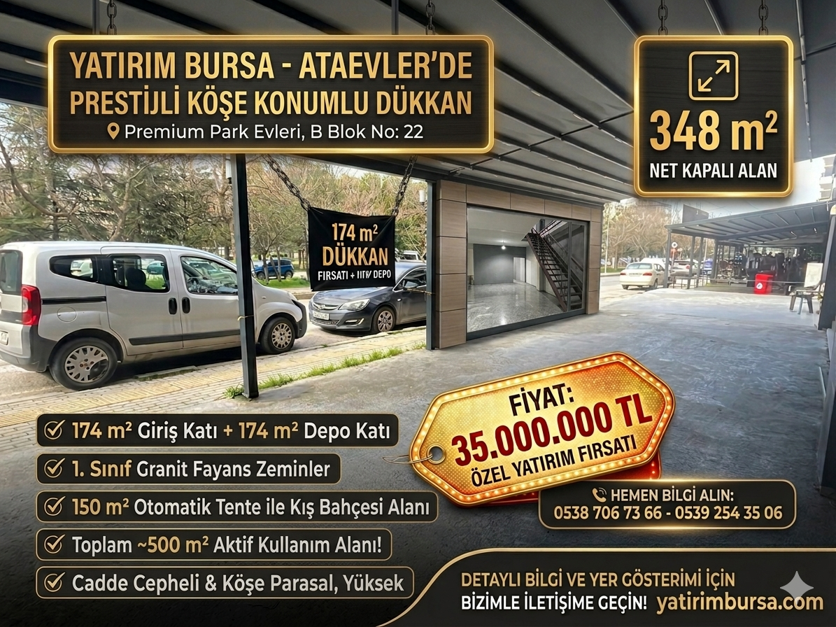 - Bursa Ataevler'in en prestijli lokasyonlarından birinde yer alan, köşe konumu ve cadde cephesi ile yüksek ticari potansiyel sunan bu özel dükkan sizleri bekliyor.