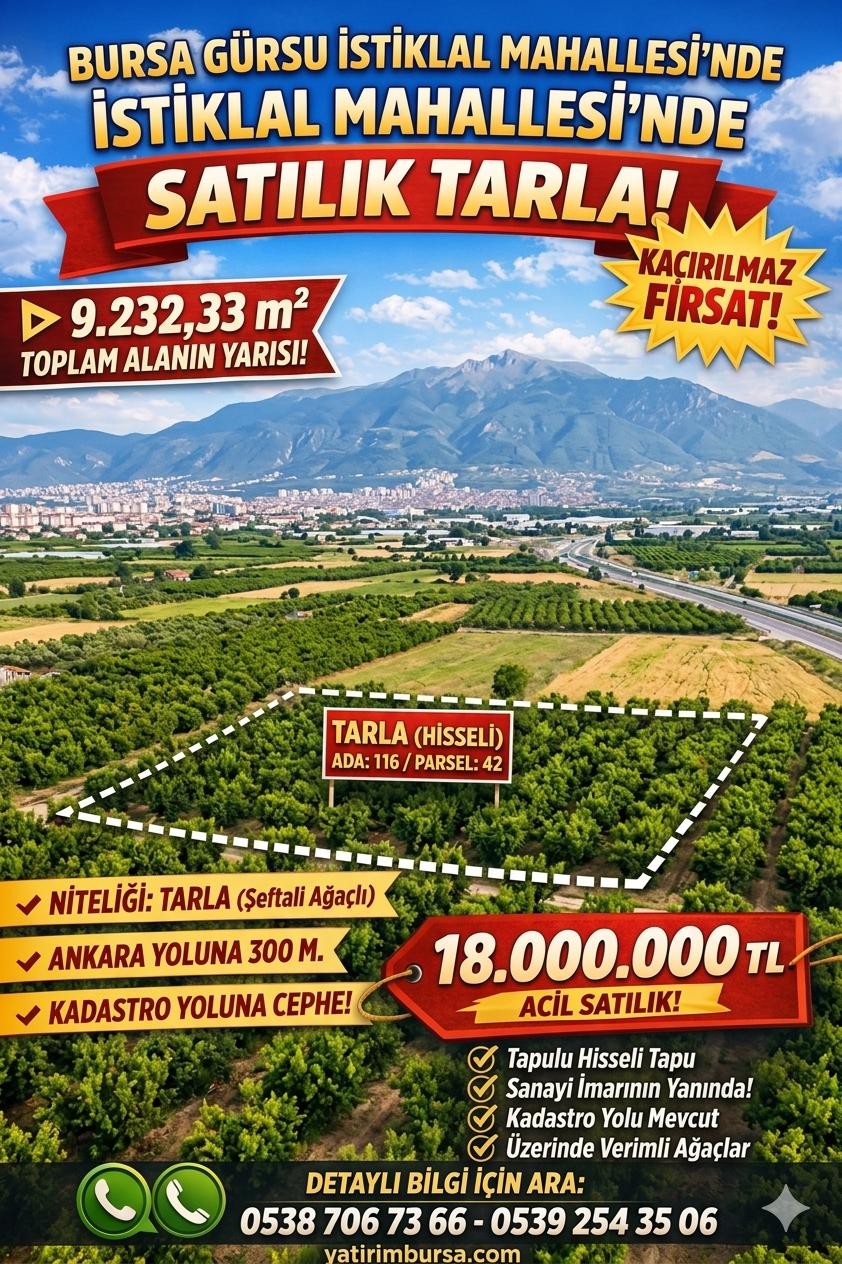 -    Gürsu İstiklal Mahallesi'nde, stratejik bir konumda yer alan 116 Ada, 42 Parsel üzerindeki 9.232,33 m² verimli şeftali bahçesinin tapulu yarım hissesi satılıktır.